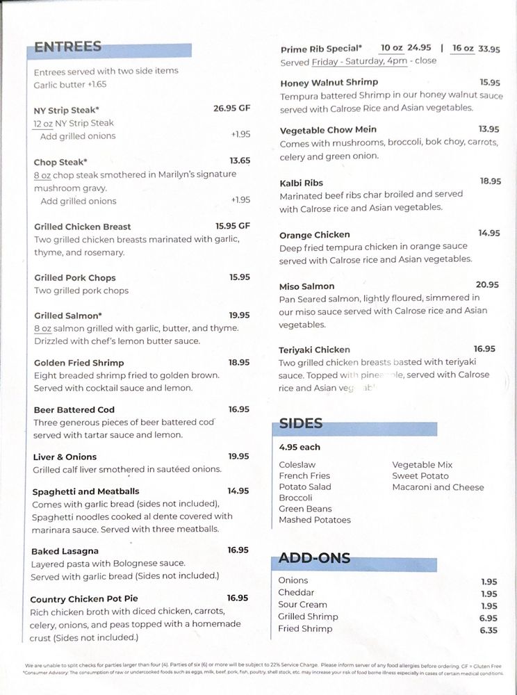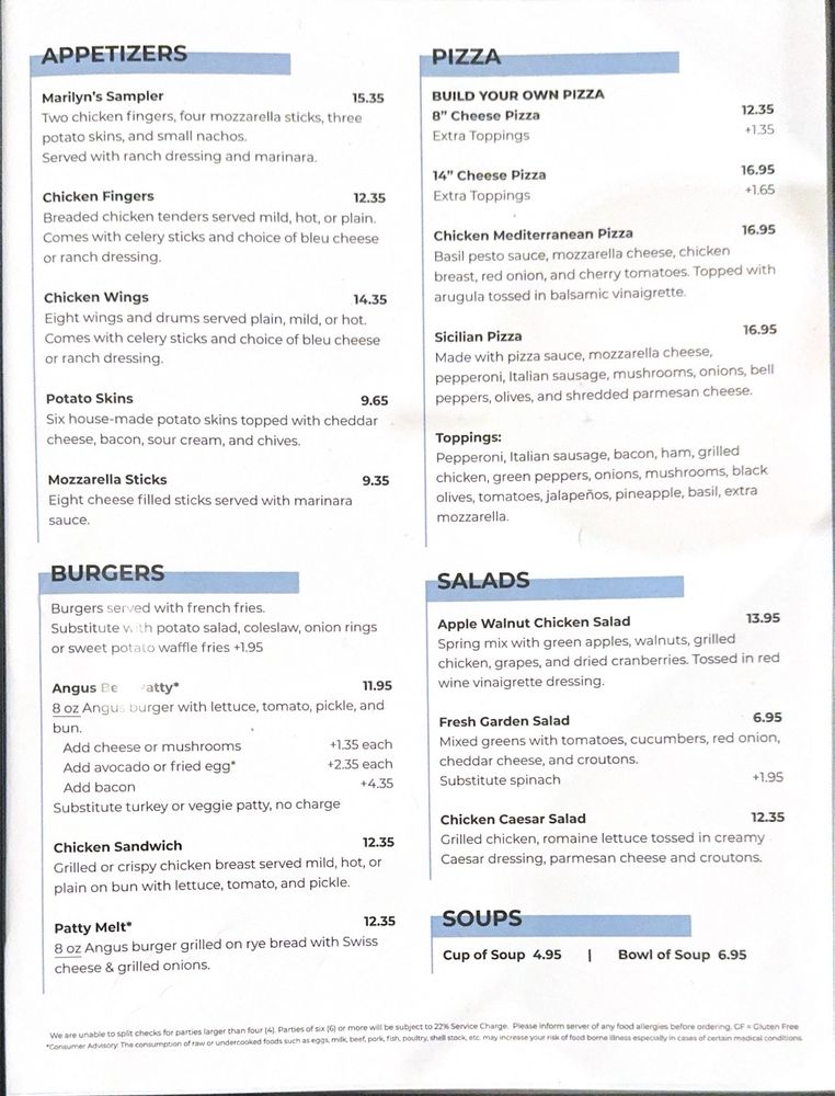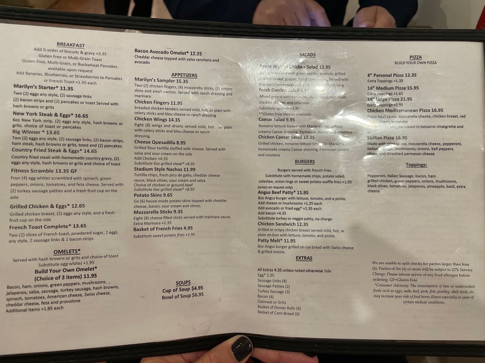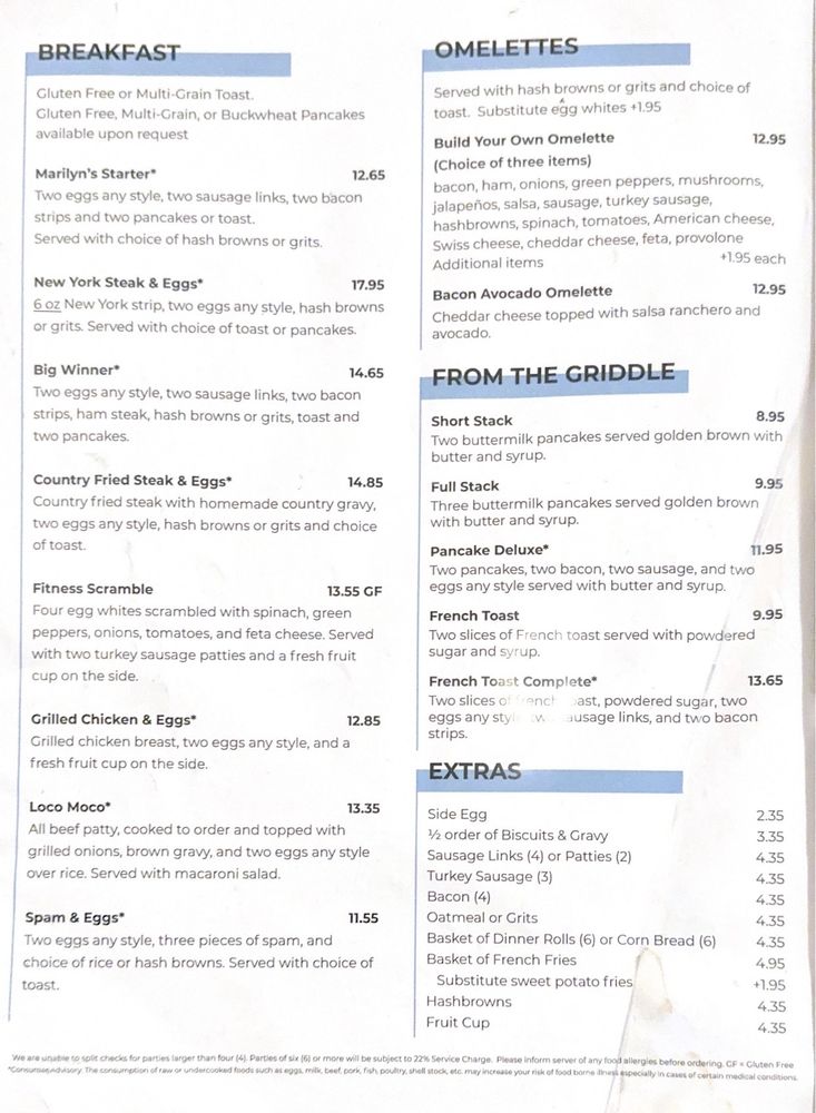 The menu features classic breakfast items like Marilyn's Starter and New York Steak & Eggs, as well as build-your-own omelets and flavorful appetizers like Chicken Fingers and Marilyn's Sampler. Customers rave about the generous portions and attentive staff, making it a go-to spot for many locals and visitors alike.