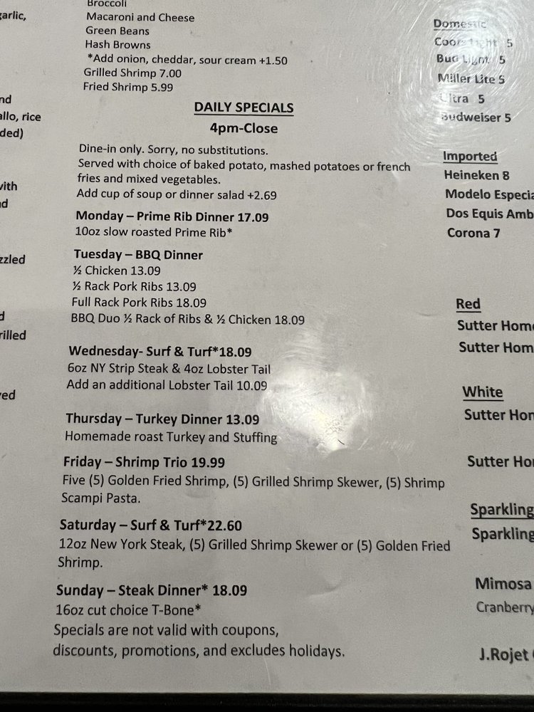 6oz New York strip, (2) eggs any style, hash browns or grits, choice of toast or pancakes